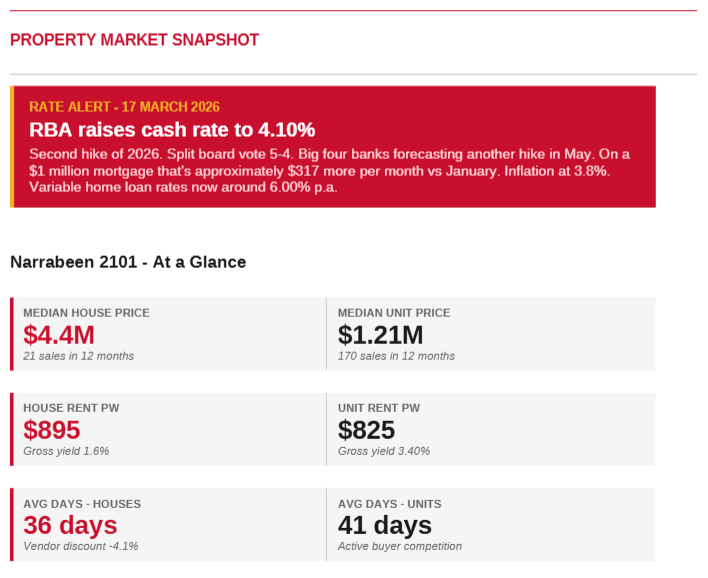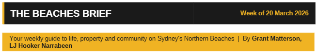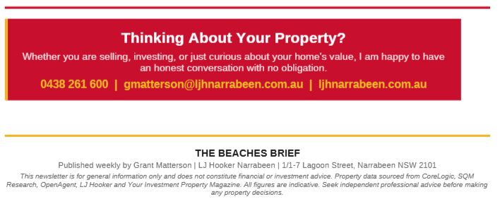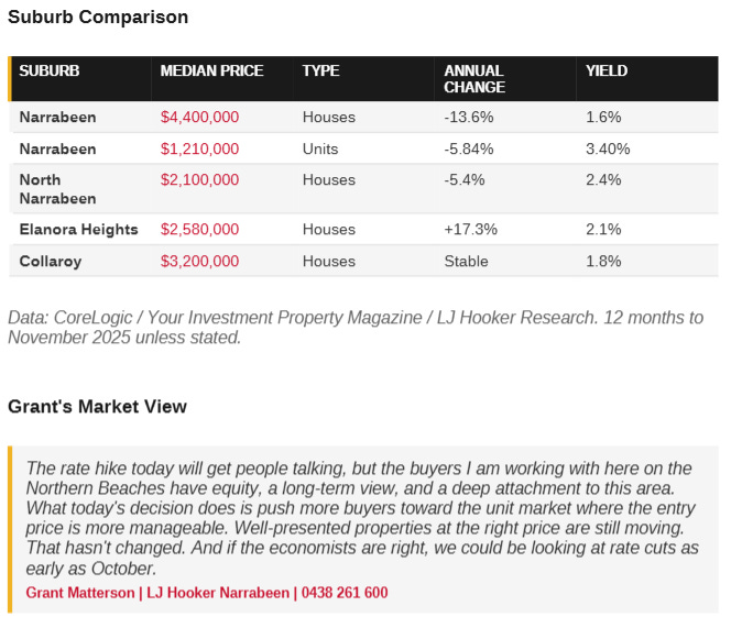 Data sourced from CoreLogic, OpenAgent, RBA, ABS, PropertyValue.com.au, YourInvestmentPropertyMag, HtAG Analytics, RateMyAgent, and Northern Beaches Council. Market data is indicative and may vary. This newsletter is for informational purposes only and does not constitute financial advice. Always seek independent professional advice before making property decisions.